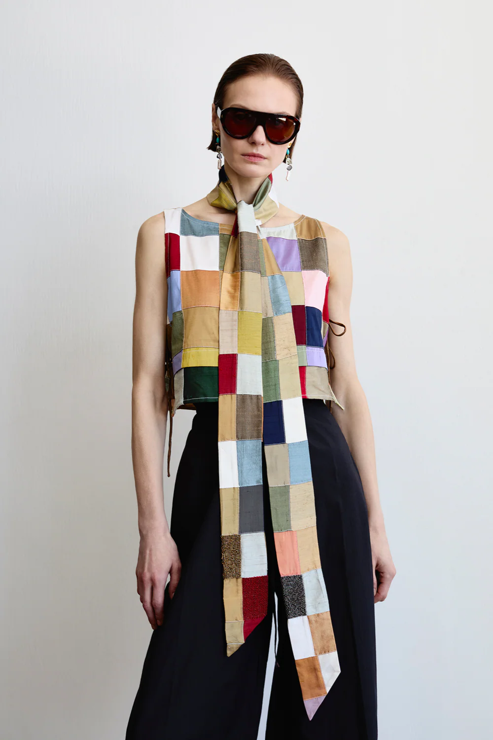 Nostalgic and tactile, patchwork evokes the history of this handmade heritage craft. Panels of raw silk are pieced together to form Gigi’s geometric body, cinching at the sides with tie closures to create the perfect fit. A high boat neck and slight cropped fit makes it a perfect pairing with cotton shorts and skirts.