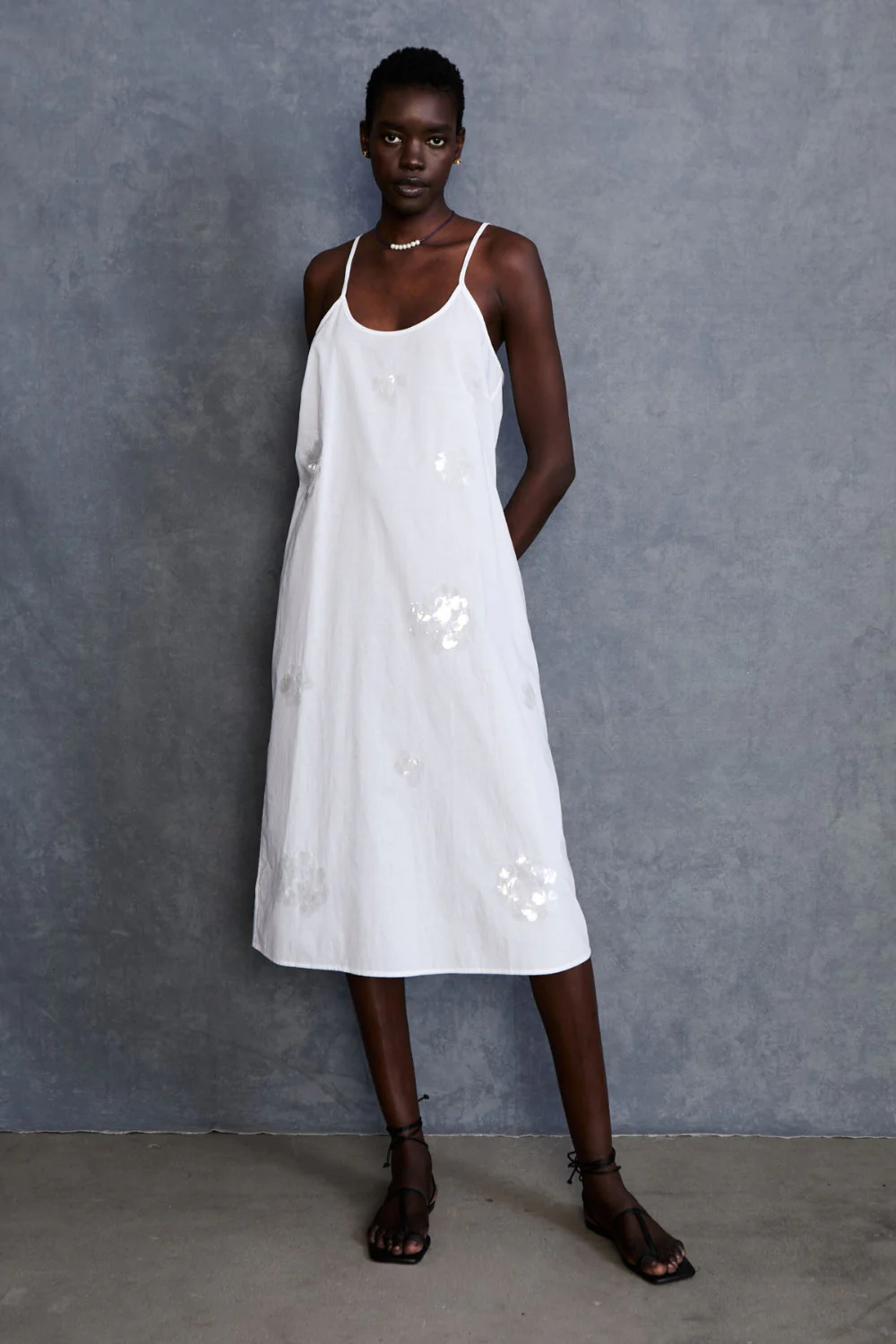 The Orb Slip Dress radiates timeless chic. The woven cotton fabric is adorned with sequin embroidery that catches the light, lending this minimalist style a touch of elevated glamour.