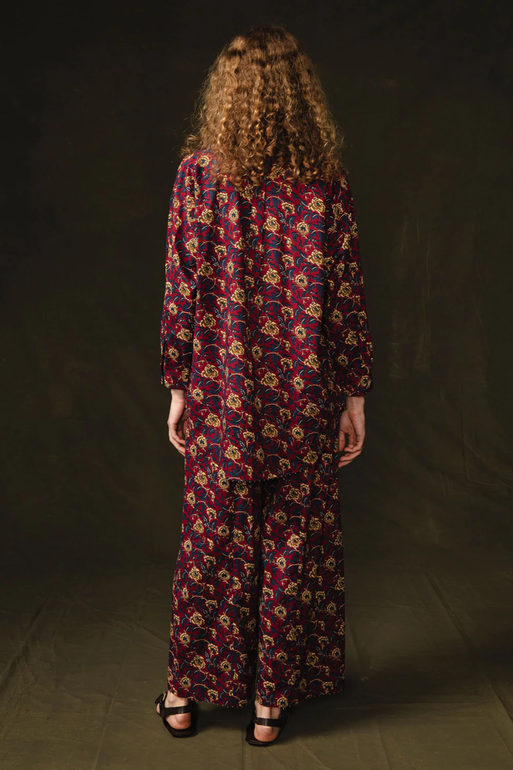 This 100% cotton set is designed for relaxed evenings and mornings at home. It features a vibrant botanical print with French knots accenting the collar and hems of both the shirt and pants. An included travel pouch offers convenient storage.